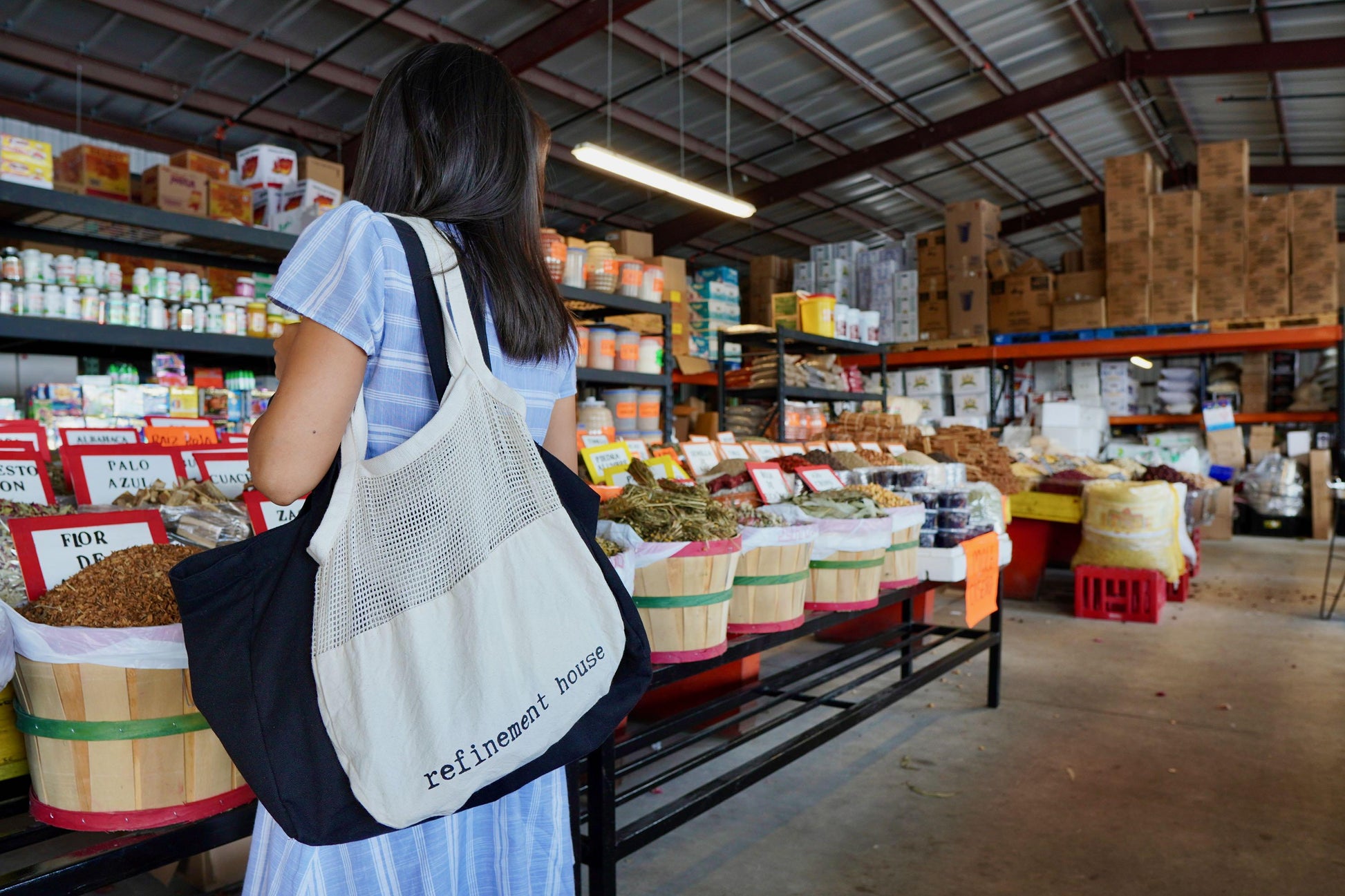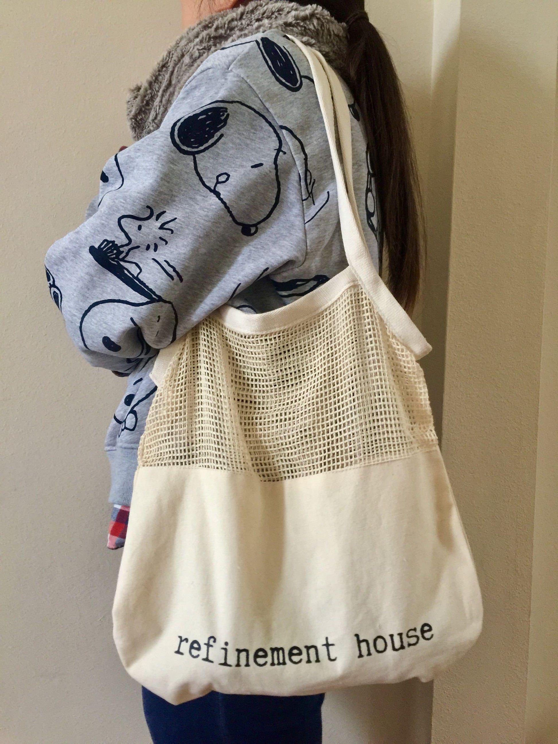 This is our signature Refinement House tote.  Thoughtfully designed with purpose and functionality in mind.  The bottom canvas serves as a catch-all for loose items and the top mesh is great for breathability.