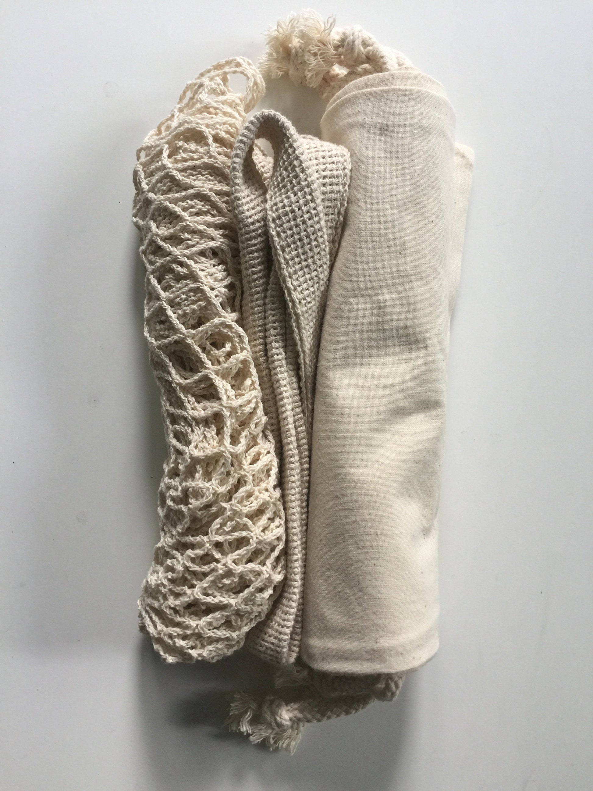 Help reduce plastic and waste with this Market Essential Kit. Made with 100% cotton, no dyes or other colorings. Natural fibers and made to last. Machine washable and can be used over and over again.