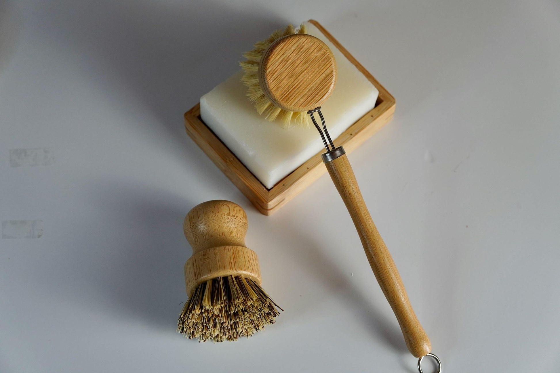 This all-natural, organic dish brush is made from sustainably sourced bamboo and agave sisal fibers. Its replaceable brush head is 100% compostable and biodegradable, making it an eco-friendly choice for your kitchen cleaning needs. To ensure longevity, keep the brush head elevated to allow for proper drying. This versatile dish brush is available as a single brush, with an additional replacement brush head, or as part of a kitchen cleaning set. Our top-selling package includes the dish brush, No Tox Life Dish Block, bamboo soap rack, and cotton bulk bag. To fully enhance your dish cleaning routine, consider adding a natural pot brush.